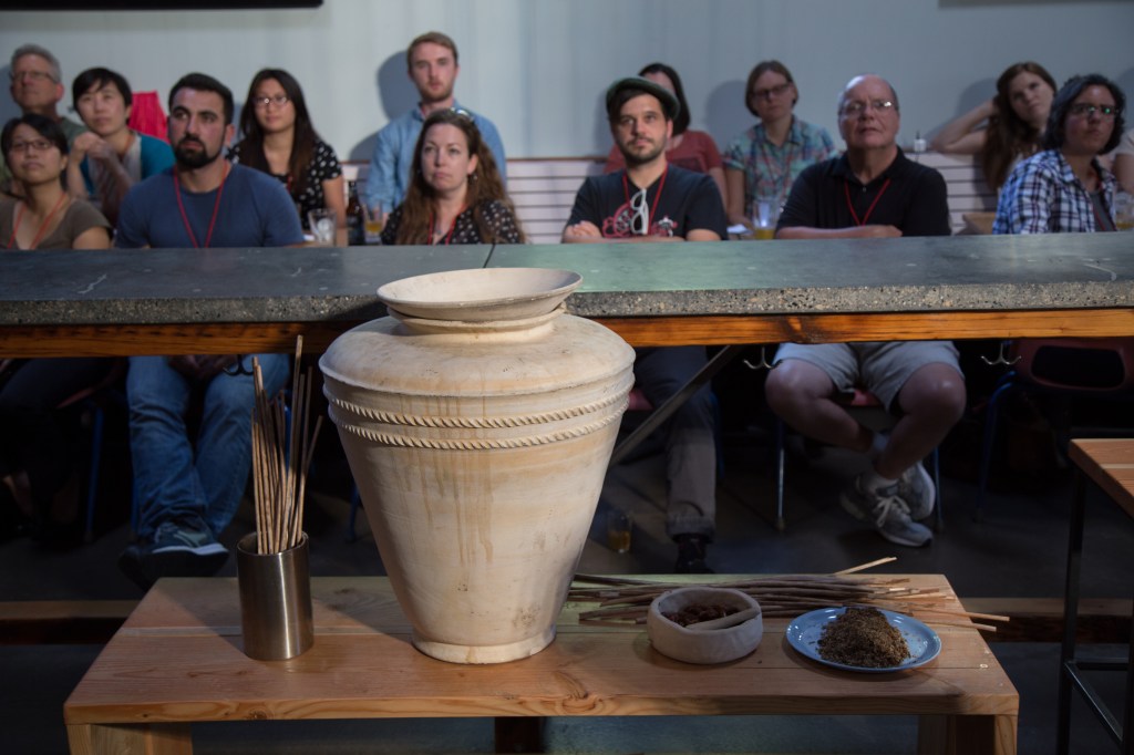 Of course, in this case, there’s also an added benefit. Our experiments resulted in perfectly drinkable beer, begging to be served up to an interested public. We held a series of tasting events in different cities. Attendees were offered two different Mesopotamian beers to try: one brewed using the replica ceramic vessels (and a cocktail of “wild” yeast strains) and one using modern brewing equipment (and a more familiar yeast). In homage to the famous adventuring duo, Enkidu and Gilgamesh, we named these beers Enkibru and Gilgamash. The difference between the two – in appearance, texture, and taste – was striking. Not all reviews were positive (you can see some here, here, here, and here), but many tasters actually preferred the Enkibru, somewhere between mildly tart and distinctly sour and flavored with a rotating cast of relatively unfamiliar herbs and spices. One highlight of every event was the drinking of Enkibru through long, reed straws from a shared communal vessel, as shown in many artistic depictions from Mesopotamia.