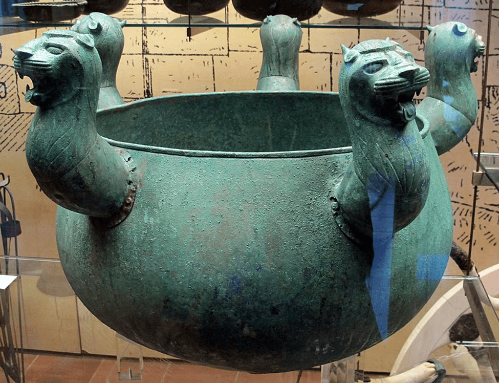 In Italy, the Etruscans are most closely connected with the “orientalizing” style, process, and period. The Regolini-Galassi tomb (7th c. BCE, discovered in Cerveteri in 1836) is often featured as the quintessential example of “orientalizing” culture, with its elaborate grave goods illustrating Near Eastern art, banqueting, writing, and an overt display of aristocratic wealth (Figures 2 and 3). In interpretations of this and other “orientalizing” tombs, adoption of eastern materials and ideas by Etruscan elites marks a sign of civilizational advancement, from Iron Age villages to Archaic Etruscan civilization, as Pallotino noted in his 1955 Art of the Etruscans (see quote) The Etruscans are believed to pass these critical building blocks to the Romans, who became revered with the Greeks by European groups as the founders of Western civilization.